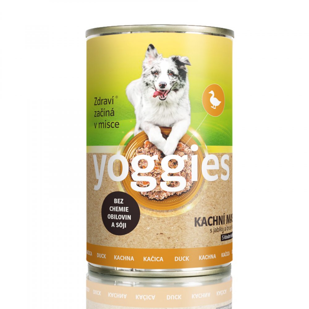 Konzerva pro psy Yoggies Kachní maso s jablky, brusinkami a kloubní výživou obsahuje kvalitní kachní maso z prověřených zdrojů, které dodá vašemu mazlíčkovi sílu k celodenním hrátkám a sportovním výkonům. Tyto konzervy obsahují šťávu a vývar z masa. Kompletní krmivo pro psy.
