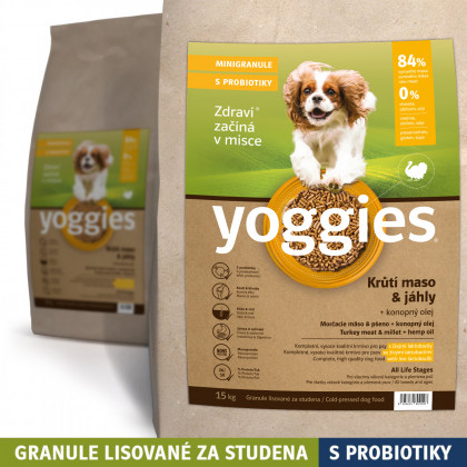 Granule lisované za studena od české firmy Yoggies jsou díky svému obsahu syrového a pomalu sušeného kvalitního masa i jedinečnému obsahu přírodních chutí, vůní i živin bez chemie skvělým a každodenním kvalitním krmivem pro mladé, dospělé i starší psy. Jako jediné granule tohoto typu na trhu obsahují probiotika (laktobacily), které podporují zdravý imunitní systém a obranyschopnost psa. Receptura granulí Yoggies je sestavena tak, aby měl váš pes požitek z chutí i vůní syrového sušeného masa (obsahují až 87 % kvalitního syrového masa před sušením), tak z chroupání, které napodobuje kousání kostí a vyplavuje endorfiny (hormon štěstí). Chroupání tvrdých granulí také mechanicky čistí chrup psa. Tyto granule jsou lisovány za studena při teplotě max.38 °C bez použití jakékoliv chemie. Jejich receptura je vyvinuta tzv. "All Life Stages" pro štěňata, dospělé i starší psy. VELIKOST GRANULÍ - MINIGRANULE pro štěňata a malá plemena psů.